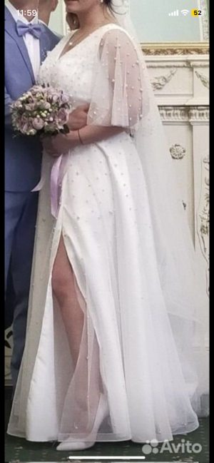 Продам свадебное платье расшитое бусинами и с разрезом. Цвет молочный, красивое. После химчистки. Цена 3000 без торга!